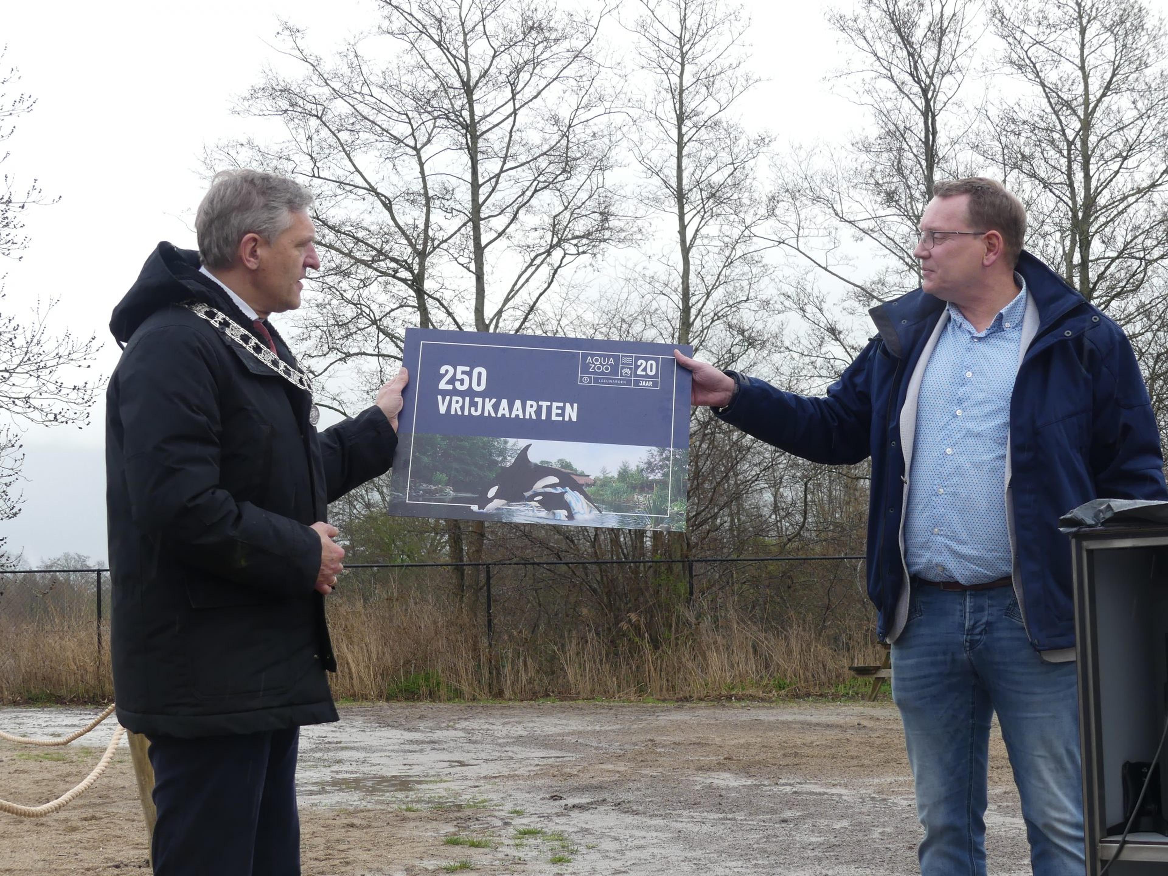 Om het twintigjarig jubileum een extra gouden randje te geven, overhandigt general manager Jeroen Loomeijer een cheque aan de burgemeester, waarbij er 250 toegangskaarten worden weggegeven aan gezinnen die zich een dagje dierentuin niet kunnen veroorloven. “We willen op deze manier de regio rondom AquaZoo Leeuwarden bedanken en iedereen de kans bieden om te komen genieten van een mooi dagje uit,” aldus Loomeijer.